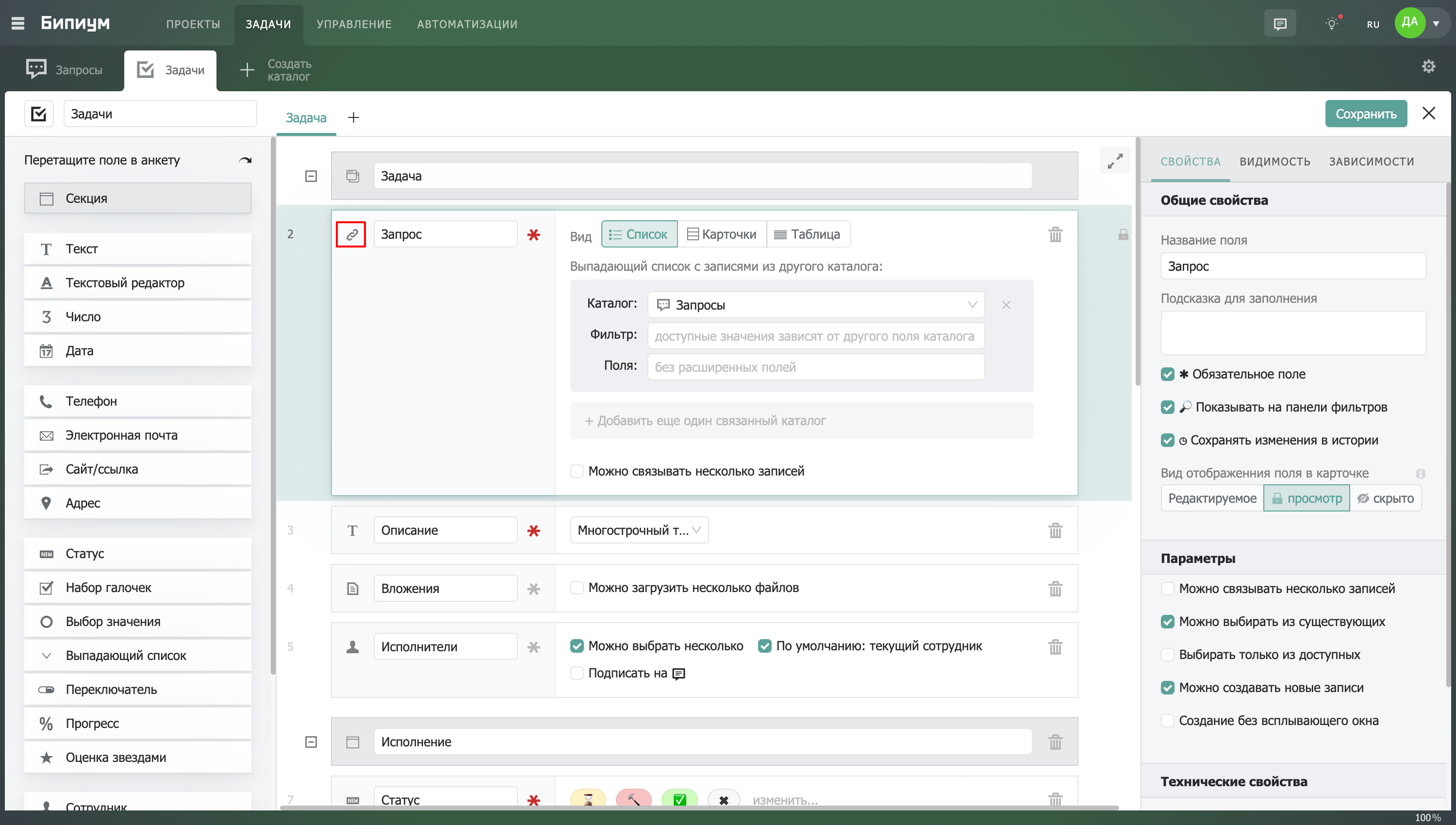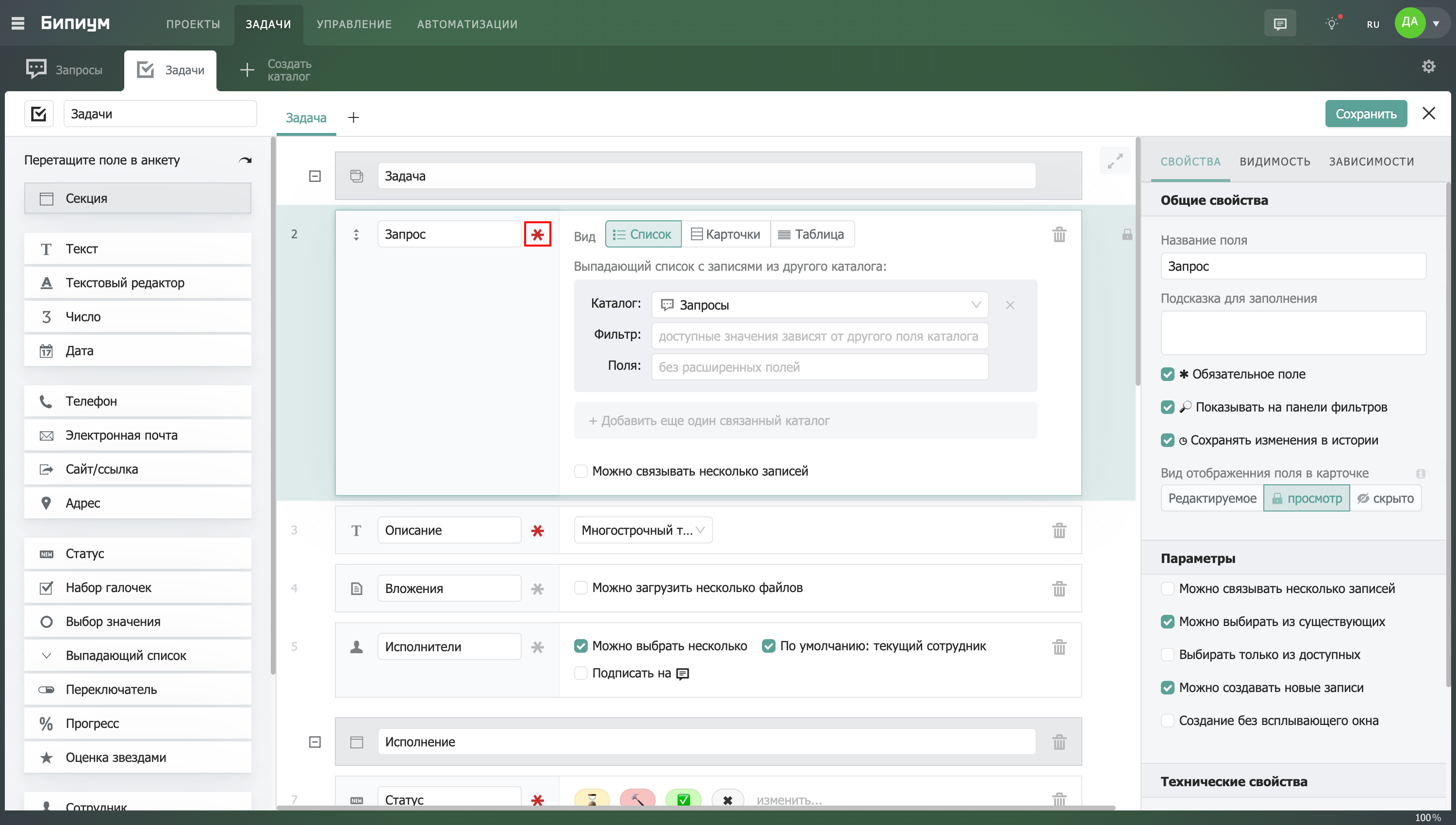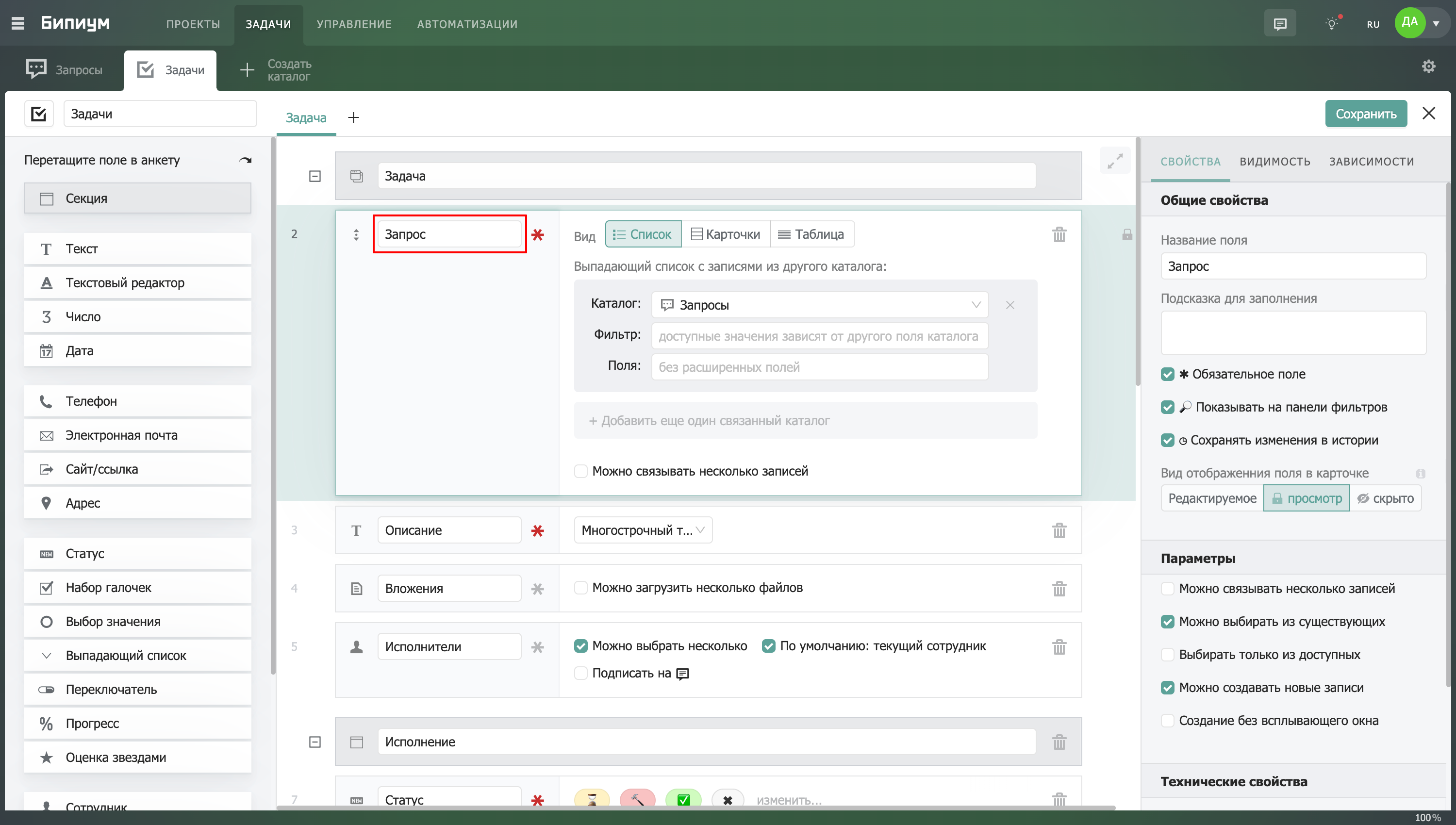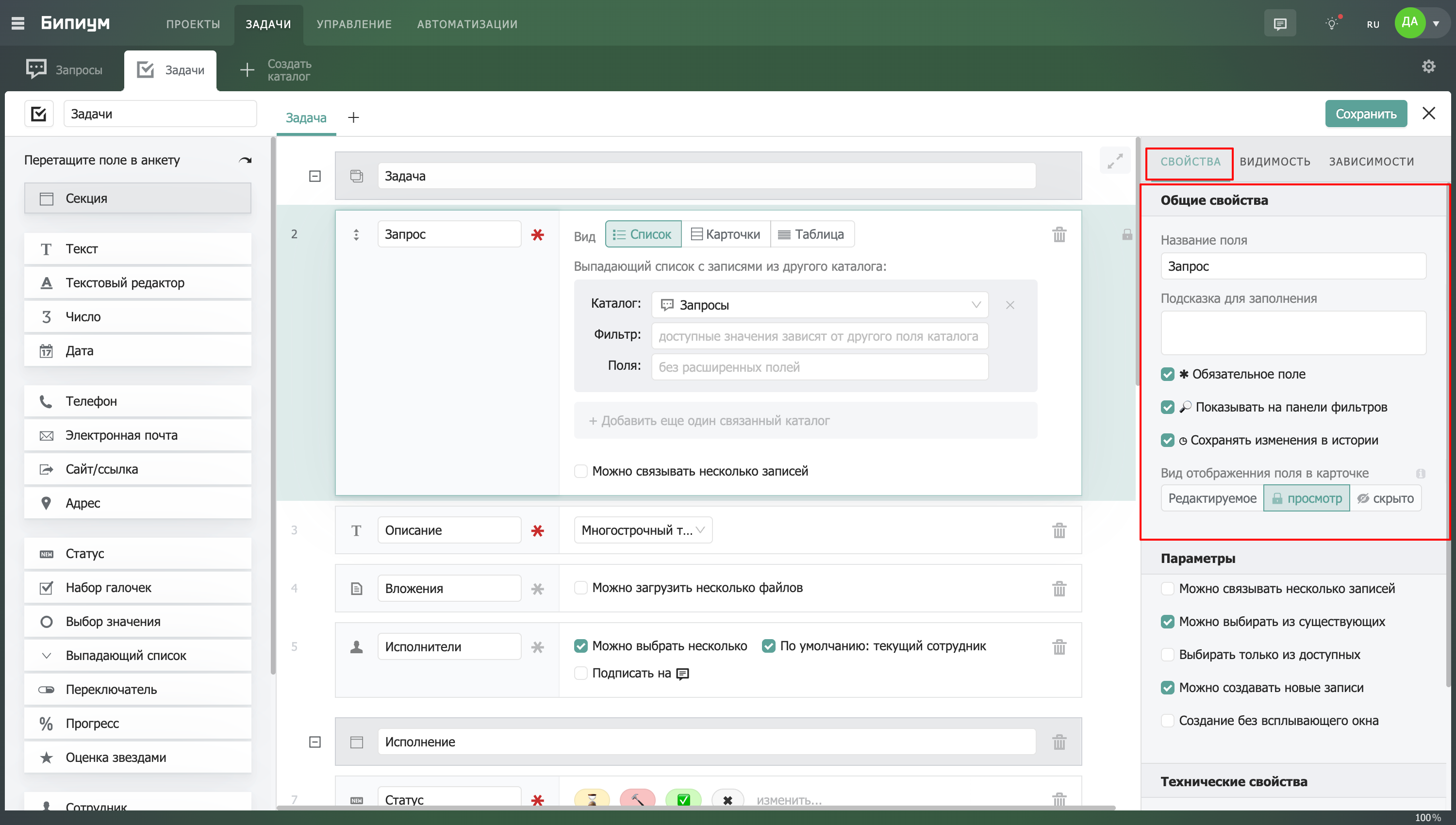 Настройка свойств. Панель с настройками позволяет настроить поле под свои нужды. Свойства бывают общие для всех полей (подробнее в Свойства) и индивидуальные для каждого поля (подробнее в статье каждого поля).