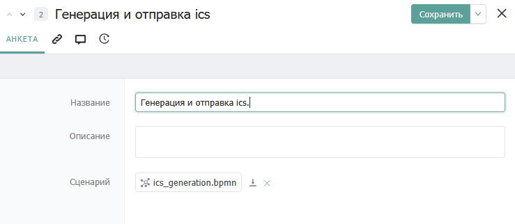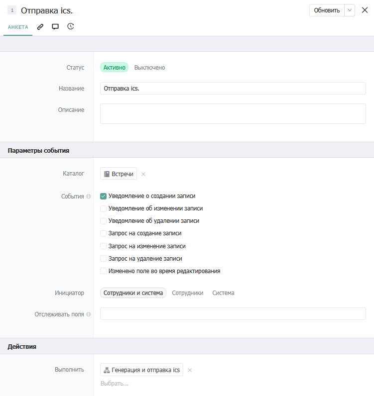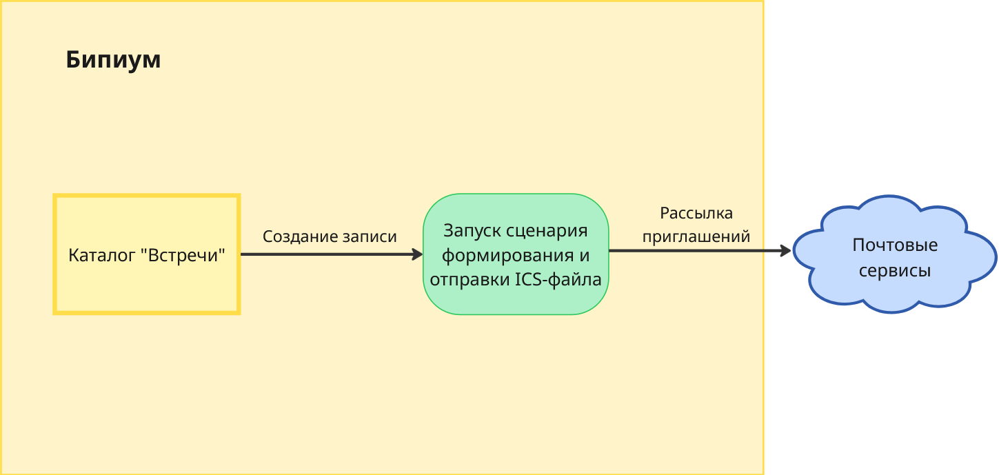 При создании записи в каталоге «Встречи» срабатывает сценарий по формированию календарного приглашения и отправке сообщения всем указанным участникам. Система автоматически генерирует ICS-файл с данными встречи и отправляет персональные приглашения на почтовые адреса участников.