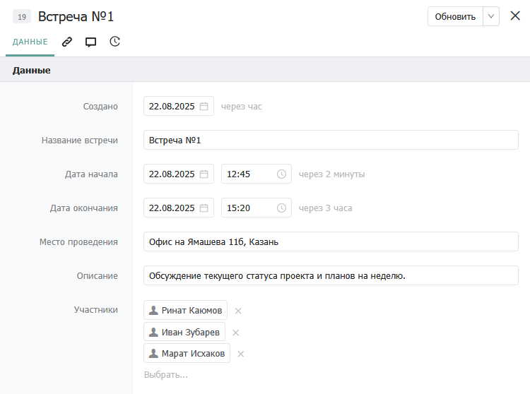 Создайте запись в каталоге «Встречи». Заполните все обязательные поля: название встречи, дату и время начала и окончания, выберите участников из каталога сотрудников. Пример заполнения представлен ниже: