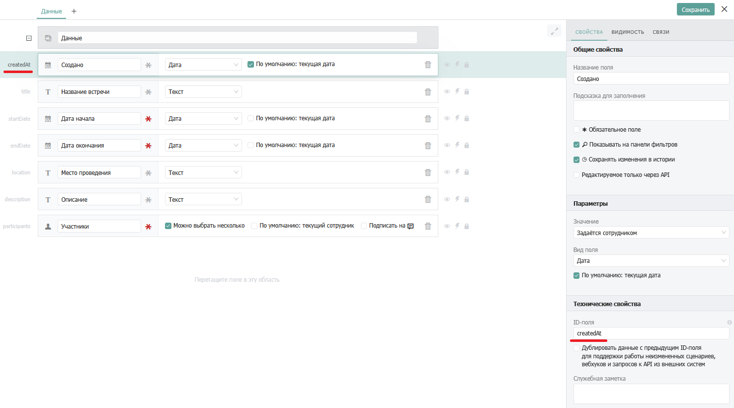 Создайте каталог «Встречи», данный каталог будет содержать информацию о всех запланированных встречах. Создание записи в каталоге инициирует отправку приглашений участникам встречи. Настройка полей представлена ниже: